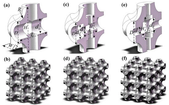 Compared with solid structures, porous structures have a significant advantage in terms of specific stiffness/strength and specific surface area resulting in excellent energy absorption capacity, thermal management and acoustic insulation. Thus, they are widely used in many engineering applications as energy absorbers, lightweight structural components, thermal transfer/shields and biological bone grafts [1,2,3,4]. Although matrix material and relative density are important factors to determine the properties of porous structures, diverse cellular structures are the main reason why porous structures become integrated structure-function engineering materials. Hence, it is necessary to investigate the effect of porous structure on properties.