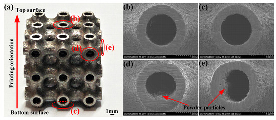 The structures of specimen HT, which was selected as the representative of all printed specimens, were observed by a Scanning Electron Microscope (SEM, S-4800, Hitachi Limited, Tokyo, Japan). It can be found that the morphologies of the local surface were slightly different, as shown in Figure 2. Melted powder adhesion was clearly observed in the structural outer surface, and, especially, the adhesion of powder particles on the side surfaces was more serious than the top surface and the bottom surface. In fact, the adhesion of powder affects the dimensional accuracy of fabricated structures [25]. In this work, to minimize the effect of adhesion particles on mechanical responses, all specimens were loaded along the top surface and bottom surface, which was also the printing orientation of the specimens. The electron universal testing machine (WDW-300, Changchun Kexin Company, Changchun, China) was employed to perform the compression tests at a strain rate of 10−3 s−1. Moreover, a high definition digital camera (i-SPEED 3, Olympus corporation, Tokyo, Japan) was utilized to record the deformation behavior of the specimens during the compression.