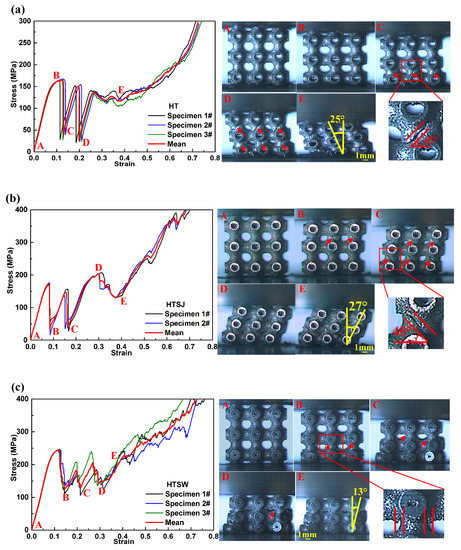 Similar compressive characteristics are presented in the loading process of specimens HTSJ and HTSW. However, there are still some differences between the specimens. (i) Specimen HTSW exhibits a remarkably higher yield strength and first maximum compressive strength (Figure 3c). Meanwhile, the plateau stress of specimen HTSW shows relatively stable fluctuations compared to specimens HT and HTSJ. (ii) The collapse positions of specimen HT and HTSJ are located in the middle of struts (Figure 3(a-C,b-C)), but specimen HTSW is collapsed in joint regions of truss structures (Figure 3(c-B)). (iii) The fracture surfaces of the collapsed struts for specimens HT and HTSJ show an angle of 45° from the loading direction. In contrast, the fracture of specimen HTSW is nearly parallel to the loading direction. (iv) The collapse layers of specimen HT and HTSJ occur in horizontal relative movement during the collapse, and the inclinations of the deformed specimens are 25° and 27° at a strain of 0.4 (Figure 3(a-E) and Figure 3(b-E)), respectively. Nevertheless, the collapse layers of specimen HTSW extend around the loading direction (Figure 3(c-E)) and the inclination of specimen HTSW is nearly 13° (nearly half the inclination of the deformed specimens HT and HTSJ), which exhibits the relatively superior structural stability of specimen HTSW during the compression.