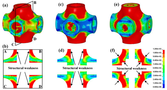 Stress distribution and sectional view ABCD at the strain of 3%: (a,b) the cell of specimen HT, (c,d) the cell of specimen HTSJ, and (e,f) the cell of specimen HTSW.