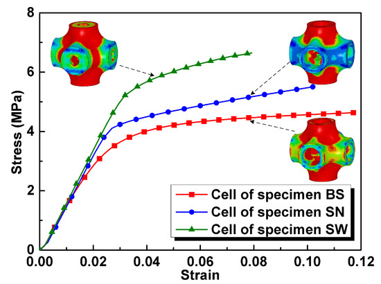 In order to reveal the reason for the differences in compressive properties of the specimens, LS-DYNA was employed to describe the compressive behavior [27]. Finite element models of unit cells for specimens HT, HTSJ, and HTSW were established, and the elastic-plastic material model was applied to describe the behavior of matrix material. The parameters are as follows: density , elastic modulus , yield strength , and Poisson’s ratio . The cells were loaded from the top surface to bottom surface at a fixed strain rate of 10−3 s−1. Figure 4 shows the stress distribution of cells and sectional views. It can be seen that the stress concentration of the cells for specimens HT and the HTSJ mainly occurs in the struts along the loading direction, while the stress concentration of the cell for specimen HTSW appears at the joint region. The sectional views clearly show the internal geometry of the different cells and the stress concentration regions are very close to structural weaknesses parallel to the loading direction, as shown in Figure 4b,d,f. It should be noted that the internal microstructures of specimen HTSW reinforce the structural weakness of hollow struts, while the internal microstructures of specimen HTSJ strengthen the non-weak regions of hollow struts. Stress-strain curves of the different cells were extracted from the numerical simulation as shown in Figure 5, and the results show that the compressive stresses were all increased with the addition of microstructures inside the cells. Thus, it can be concluded that adding different internal microstructures changes the structural weaknesses of the original cells and leads to the different bearing capacities of the cells. Moreover, compared to the cell of specimen HTSJ, the compressive stress of the cell for specimen HTSW is higher. This indicates that strengthening the internal weakness of the cells parallel to the loading direction is a more effective way to improve the mechanical properties. Therefore, specimen HTSW presents superior mechanical properties in all specimens due to strengthening the internal weaknesses of the cells.