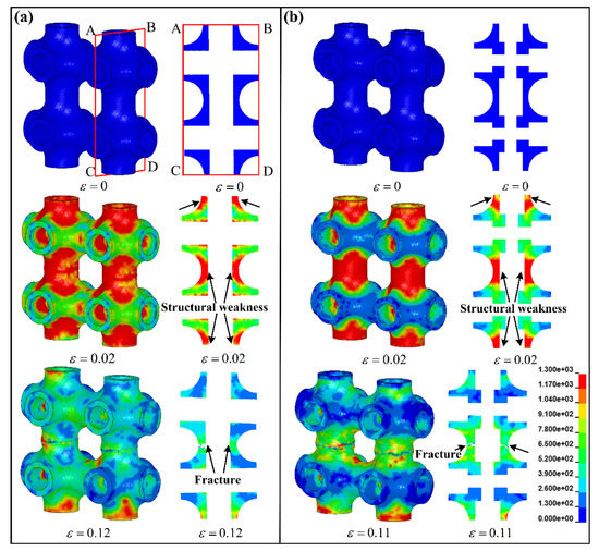Figure 6 exhibits the stress distribution and deformation state of the local cells for specimens HT and HTSJ to reveal the effect of internal microstructures on collapse positions. It can be vividly seen that the hollow struts parallel to the loading direction are the main bearing microstructures based to the stress distribution, which can be clearly observed at the strain of 0.02. Then, the hollow struts between the upper and lower cells collapsed in the middle of struts as the strain increased to 0.12. In order to fully reveal the failure characteristics, a sectional view ABCD of the local cells was extracted. It can be observed that the stress concentration of specimen HT is obvious in the hollow struts parallel to the loading direction. The stress concentration regions also correspond to the structural weaknesses of the cells, which are marked by the black arrow in Figure 6a. Afterwards, the collapse position appears in the structural weaknesses. The internal microstructures of specimen HTSJ reinforce the joint regions (non-weak regions of the cell), and the stress concentration also occurs in the hollow struts as shown in Figure 6b. From the failure mechanism of specimens HT and HTSJ, it can be concluded that the structural weaknesses (the middle of hollow struts) parallel to the loading direction cause the stress concentration and lead to the collapse of hollow struts. Actually, the collapse position is largely determined by the structural weakness in the loading direction.