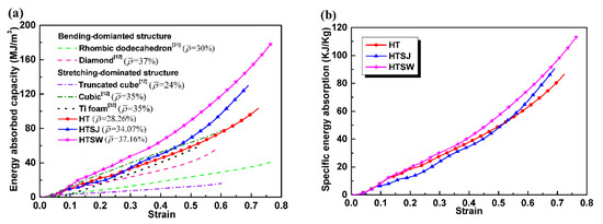 Deshpande [2] grouped the porous structures into two categories: stretch-dominated structures and bending-dominated structures. Here, for a comprehensive comparison, the curves of bending-dominated structures (diamond [12], rhombic dodecahedron [31]), stretching-dominated structures (cubic [12] and truncated cuboctahedron [12]) and titanium foam [32] were obtained to compare the energy absorption capacity of the hollow truss structures (stretch-dominated structure in this work). It is worth noting that the matrix material of bending-dominated and stretching-dominated structures is all Ti-6Al-4V, and their relative densities range from 24% to 37%. Although the relative density of the diamond structure, cubic structure, titanium foam, specimen HTSJ and HTSW are very close, specimen HTSW exhibits a stronger energy absorption capacity than the other specimens. In fact, this further verifies that strengthening the internal weaknesses of the hollow truss structures does help to improve the energy absorption capacity.