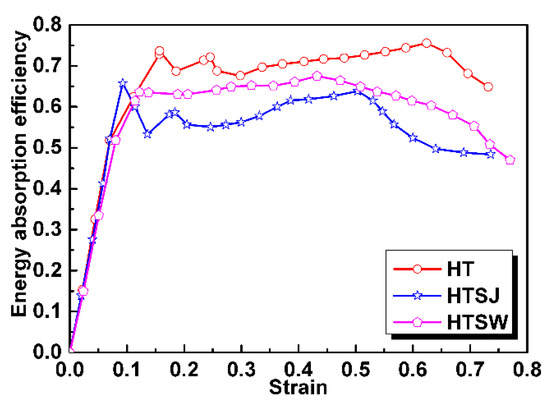 Figure 9 presents the curve characteristics of the specimens including the rising stage, the stable stage and the declining stage. In the rising stage of the curve, the energy absorption efficiency increases rapidly. Next, a relatively steady stage of the energy absorption efficiency within a wide strain range, which is related to the plateau stage of the compressive stress–strain curve, is found. At the declining stage, the energy absorption efficiency gradually decreases. Specimen HT has the most superior energy absorption efficiency including the highest efficiency peak and later decay behavior, resulting from its relatively stable plateau stress and wide strain range. Although the energy absorption efficiency of specimen HTSW takes second place, its curve has minimal fluctuation over the entire strain range, which shows that specimen HTSW presents the best stability during compression. This shows to some extent that strengthening the internal weaknesses of the hollow truss structure is beneficial to improve compressive stability in the energy absorption process.