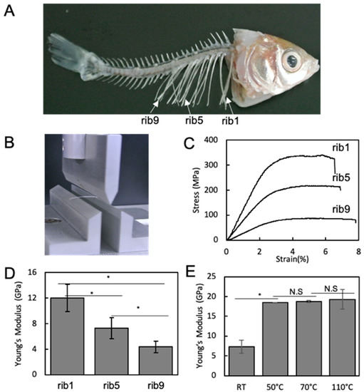 Fish bones have soft and strong mechanical properties [19]. In order to understand the reason for this, we investigated the microarchitecture and constituents of the fish bone. Especially, in this study, focusing on the Carassius langsdorfii, the large size rib1, the medium size rib5, and the small size rib9 were extracted and compared. When examining the mechanical properties, each rib showed a typical stress and strain profile. In terms of Young’s modulus, rib1 showed the highest, and the value became lower with the increase the rib numbers. In order to examine the effect of water and organics on this suppleness, the extracted bone was heated to remove the water, and the mechanical properties were examined. Increased Young’s modulus of the heated bone tissue was observed (Figure 1).