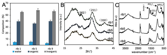 Next we examined the contents of water, organic components, and inorganic components by measuring the weight in the drying process. In any ribs, the water content was approximately 5%, the organic components were 35–40%, and the inorganic components were less than 60%. Among these, no significant difference was observed. As a result of XRD analysis, all ribs showed apatite-based diffraction peaks. Rib9 showed lower crystallinity than other rib1 and rib5 according to the sharpness of peaks. As a result of examining each peak based on the results, it was confirmed that the crystal had a high orientation in the long axis direction [20]. In the FTIR study of the components, peaks of carbonate were also observed in addition to peaks of phosphate (Figure 2).