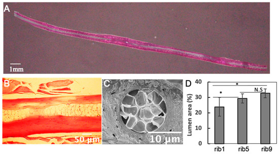 Histological observation of Carassius langsdorfii rib bone. (A,B) Hematoxylin and eosin (HE) stained images of cross-section of rib5. A cavity structure is found in the center. (C) SEM image of the cross-section perpendicular to the long axis of rib5. The presence of hypertrophic chondrocytes can be seen in the central part. (D) The larger the number of ribs, the larger the lumen observed. * indicates a significant difference (p < 0.05).