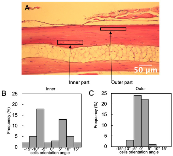 To understand the mechanism of this orientation, the orientation of osteocytes constituting the bone matrix was examined from the HE-stained images. Interestingly, osteocytes existing on the outer region of the bone matrix showed a better cellular alignment than those in the inner region. The results were similar regardless of the rib number (Figure 5).