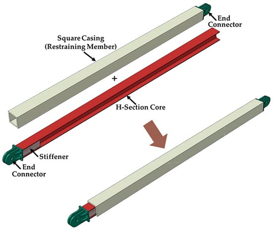 Buckling-Restrained Braces (BRBs) have been widely implemented in framed structures to reduce damage during severe earthquakes [,]. Unlike conventional braces that buckle under compression, the core of BRBs yields both in tension and compression under the restraining effect of the casing. The casing should provide sufficient restraint against global buckling to ensure stable hysteresis and energy dissipation, and local buckling of the core and the casing should be avoided.