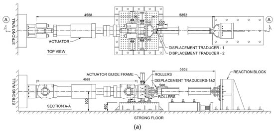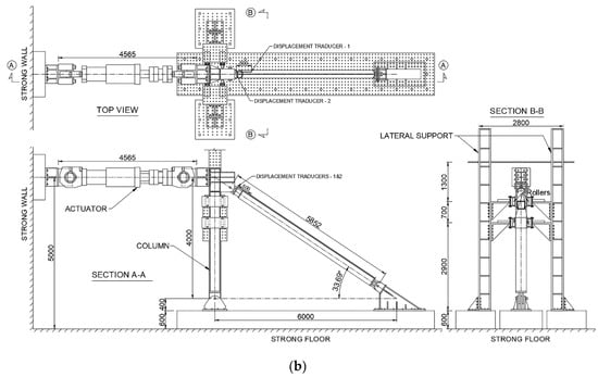 The test was conducted in the two setups shown in Figure 3a and b using a 3000 kN hydraulic actuator. Specimens 1–3 were tested in the brace test setup shown in Figure 3a, whereas Specimen 4 was tested in the subassembly test setup shown in Figure 3b. In the brace test setup, the BRB was positioned horizontally, and pin-connected to the actuator and a reaction block on the two ends. The out-of-plane and vertical movement of the actuator was prevented by a set of roller supports that fitted the width and depth of the actuator head, as shown in Figure 3a. In the subassembly test setup, the BRB specimen was positioned at a 33.69° inclination angle (4 m story height and 6 m span), and pin-connected to a column, as shown in Figure 3b. The opposite end of the BRB specimen and the column base were pin-supported to the laboratory strong floor. The out-of-plane movement of the assembly was restrained by a lateral support frame, which was connected to the column through a set of rollers that fitted the width of the column. Displacement transducers 1 and 2, shown in Figure 3a,b, were used to measure the relative displacement between the core and the casing, and the relative displacement between the brace ends, respectively.