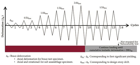 The quasi-static cyclic loading protocol specified in the American Institute of Steel Construction seismic provision [] is shown in Figure 4. The loading protocol starts with two cycles of Δby, followed by two cycles of 0.5Δbm, 1.5Δbm, and 2.0Δbm each, where Δby and Δbm indicate the displacement corresponding to core yielding and design story drift, respectively. In this test, Δbm was set to 1.0% of the story height [], and Δby was calculated as a 7.3 mm brace axial displacement based on the yielding length of the core and the yield strength obtained from the coupon tests. The modulus of elasticity was set to 200 GPa. Following the two 2.0Δbm cycles, the loading protocol continues with fatigue loading at 1.5Δbm loading amplitude until the cumulative inelastic deformation exceeds 200Δby. Fatigue loading is not required for the subassembly test setup [].