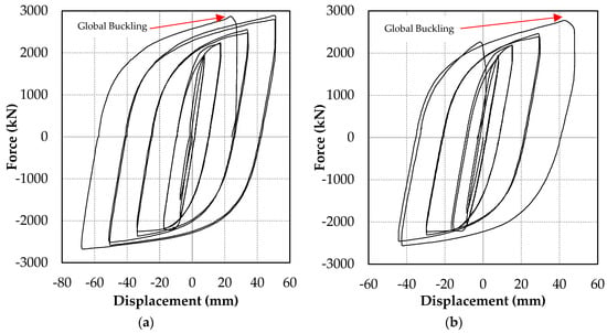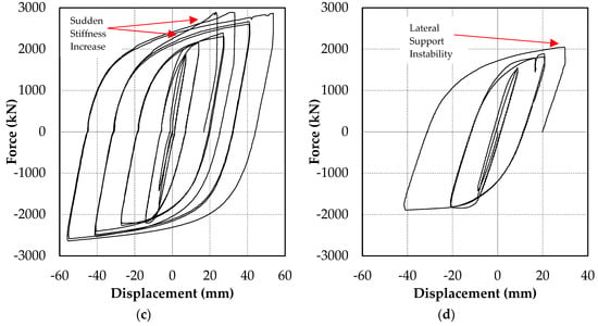 Figure 13 shows the deformed shape of the parametric study models at the 2.0Δbm cycle (d = 80 mm or 2.0% drift). Figure 13a–d show the influence of Lus. As observed in the figures, flange buckling occurred at the end of the stiffener regardless of the stiffener length.