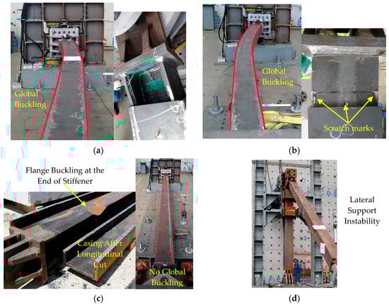 Failure mode of test specimens: (a) Specimen 1—global buckling and unconstrained-length deformation; (b) Specimen 2—global buckling and scratch marks on the unconstrained length; (c) Specimen 3—flange buckling and no global buckling; (d) Specimen 4—lateral support instability.