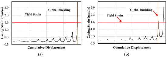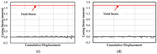 The yield strain presented in Figure 8a–d was calculated as the ratio of the casing yield strength to the modulus of elasticity (200 GPa).