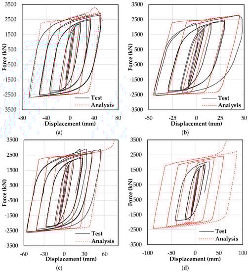 Hysteretic responses. Specimens (a) 1, (b) 2, (c) 3, and (d) 4.
