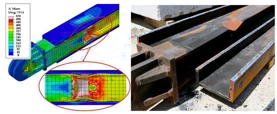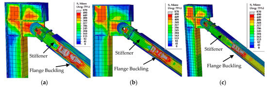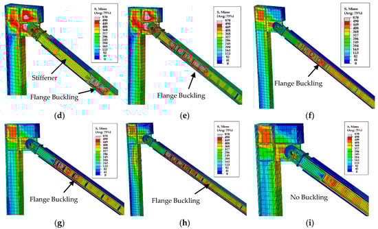 Figure 13e–h show the influence of flange stiffeners and stiffener spacing. As can be observed from the stress contours, the use of flange stiffeners resulted in stress concentration in the core web. Moreover, flange buckling was observed in all FS models and occurred where the stiffener spacing was 400 mm or above 400 mm in all the FS models.