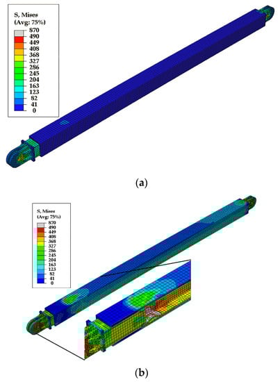 To better understand the NOVEL brace, an analytical study using the finite element computer program ABAQUS/CAE 2017 (Dassault Systemes Simulia Corp., Johnston, RI, USA) [] was conducted for 14 NOVEL brace models in the subassembly setup. Previously, Specimens 1–4, called Models 1–4, respectively, were analyzed under cyclic load to validate the finite element model. In particular, elastic modulus of 200 GPa and the stress–strain relation obtained from the coupon test were converted to the true stress–strain and applied to the corresponding components of the brace. Material nonlinearity with the von Mises yield criterion was considered, and the cyclic hardening behavior was modelled using the combined isotropic and kinematic hardening model following the true stress–strain data [,]. All brace components were modeled with 20 node solid elements, C3D20R, and the interaction between the core and the casing was modeled as a hard contact with no penetration. Separation after contact was allowed to permit separation during tension loading. The tangential behavior of the contact was modeled through a penalty friction formulation with a friction coefficient of 0.8 to simulate the dry steel-to-steel interface.