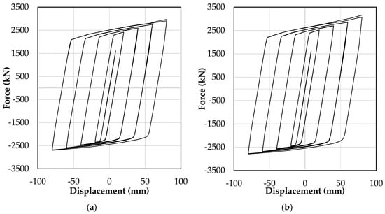 Figure 6 shows the load–deformation curve of the test specimens with compressive force and displacement on the positive axis. The displacements shown in Figure 6 were measured by displacement transducer 2. Figure 6a,b and Figure 7a,b demonstrate that Specimens 1 and 2 failed by global buckling, which occurred during the first compression loading of the 2.0Δbm and 1.5Δbm loading cycles, respectively. The maximum measured axial displacement of Specimen 1 prior to global buckling was 51 mm in compression and 68 mm in tension. Meanwhile, for Specimen 2, it was 48 mm in compression and 44 mm in Tension. Following the global buckling of Specimens 1 and 2, the sideways bending of the BRB resulted in close contact between the core and the casing; this is shown in the unconstrained length’s deformed shape and scratch marks displayed in Figure 7a,b.