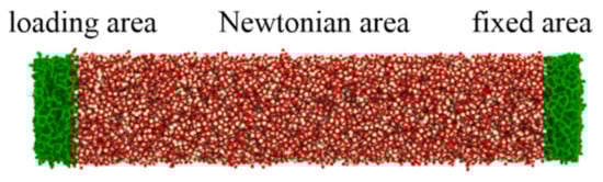 The atoms within cylindrical nanowires were divided into three areas: the fixed area, the loading area and the Newtonian area, as shown in Figure 1. The fixed area, containing 2980 atoms, was positioned at the bottom of the nanowire and was frozen to stabilize the nanowire during tension. The loading area, which was designed as a rigid body at the other side of the nanowire, could transmit stress from the loading area to the Newtonian area. The atoms within the Newtonian area were sandwiched between the fixed area and the loading area. These atoms could freely move according to Newton’s second law. Before loading, the nanowire was first relaxed to local energy minimum by the steepest descent algorithm. It was then relaxed using the canonical (NVT) ensemble with the Nose–Hoover thermostat for 60 ps to reduce the global potential energy of the nanowire. After stabilization of the nanowire, the uniaxial tension was performed through displacing the atoms within the loading area at a constant strain rate of 2.5 × 107 with a time step of 0.5 fs. The tension system maintained a constant temperature of 300 K by using the NVT ensemble during the whole tension process. Non-periodic boundary conditions were applied in three axes.