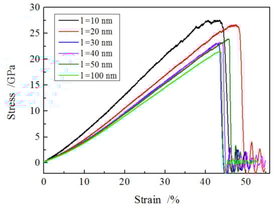 A series of uniaxial tension tests was conducted for different cylindrical nanowires with the same diameter (6 nm) but various lengths (10, 20, 30, 40, 50 and 100 nm); the detailed simulation process is given in the above section. The applied stress and strain of the nanowires during tension are monitored, and the relationship between the two was obtained and summarized in Figure 2; it showed that the stress increased steadily with the growing strain, then declined quickly after reaching its fracture strength, meaning a brittle mechanism occurred in the SiO2 nanowires. It was found that there was a decrease in applied stress with increasing nanowire length at the same strain prior to fracture, e.g., 17 GPa and 12 GPa for the length of 10 nm and 100 nm nanowires at the strain of 25%, respectively. The fracture strength of the nanowires grew with decreasing length, which was in accordance with Han’s results [30].