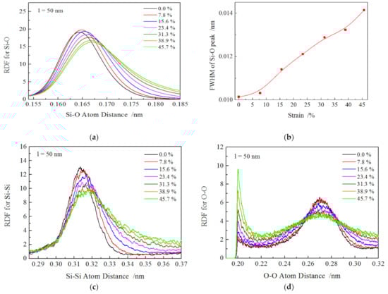 The amorphous SiO2 is composed of numerous randomly distributed ordered SiO4 tetrahedra. To investigate the plastic deformation characteristics of amorphous SiO2 during tension, the radial distribution function (RDF) of three atom pairs was obtained, as shown in Figure 3. As the tension proceeded, the Si–O peak shifted right, its height declines while its width (or the full width at half maximum) of Si–O peak (FWHM) in Figure 3b) increased as the strain grew, which implies that the average Si–O distance enlarged from equilibrium value (0.162 nm for the as-prepared nanowires, close to the values of experiment measurement [31]) to a larger value of 0.167 nm, as shown in Figure 3a. The Si–Si RDF exhibited a similar trend to that of Si–O RDF in Figure 3c. The RDF of O–O atom pair is shown in Figure 3d. It was found that the average O–O atomic distance was 0.265 nm at the strain of 0.0%, which was also in accordance with the experimental results [31]. Moreover, it is interesting to note that an extra peak appeared in the O–O RDF at the distance of about 0.2 nm; the extra peak expanded apparently while the main peak of O–O RDF decreased with the increasing strain. In addition, there was an extra small peak in O–O RDF at the strain of 0.0%, which differed from the result of amorphous SiO2 at the strain of 0.0% during loading [32,33,34,35], where no extra O–O peak appeared. This difference may have been caused by the high ratio of specific surface area to volume of cylindrical nanowires compared with amorphous SiO2 films and its bulk counterparts.