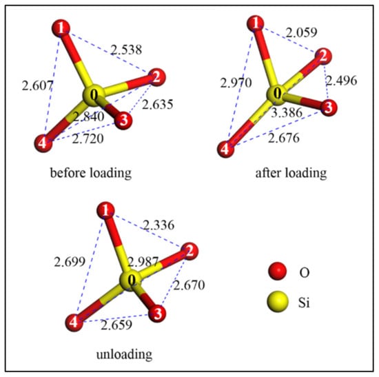 The reason for the appearance of an extra O–O peak can be explained by Figure 4. It shows that in the as-prepared amorphous SiO2 cylindrical nanowire (before loading), the SiO4 tetrahedron within it was almost short-range ordered, and O–O atomic distances were 0.2538, 0.2635, 0.2720, 0.2840 and 0.2607 nm between oxygen atoms O1–O2, O2–O3, O3–O4, O2–O4 and O1–O4, respectively. As the tension strain increased to 45.7%, the original ordered SiO4 tetrahedron became stretched along the loading direction. The corresponding O–O atomic distances were hence changed to 0.2059, 0.2496, 0.2676, 0.3386 and 0.2970 nm, respectively. The massive reduction of O–O atomic distance within SiO2 (e.g., O1–O2 atoms) during tension leads to the increasing of the extra peak in the O–O RDF at a distance of 0.2 nm. After unloading, elastic recovery occurred to these O–O atoms and the corresponding distances changed to 0.2336, 0.2670, 0.2659, 0.2987 and 0.2699 nm, respectively. Conclusively, the original short-range ordered SiO4 tetrahedra within the as-prepared SiO2 became disordered during tension, and these disordered SiO4 tetrahedra could not recover to their original state even as the stress was released, indicating the plastic deformation indeed occur to amorphous SiO2 nanowire by the deformation of numerous SiO4 tetrahedra. The changes of RDF for amorphous SiO2 nanowire during tension were similar to those for previous indentation tests, where the SiO4 tetrahedron was flatted due to indentation [32,33,34,35].