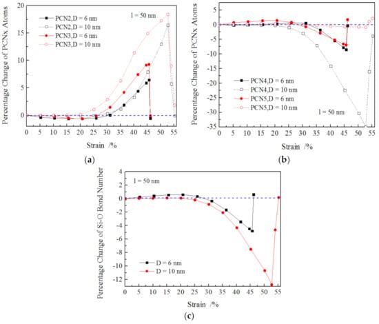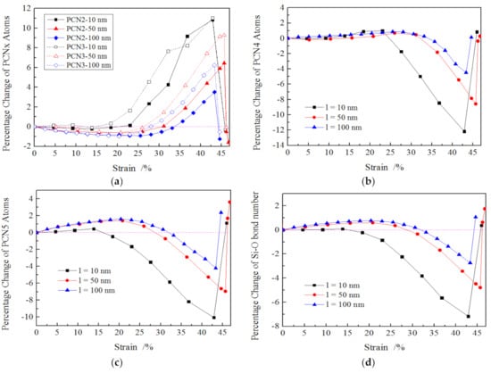 To further probe the plastic deformation characteristics of amorphous SiO2 nanowires, the number variations of coordinated silicon atoms within amorphous SiO2 were carefully analyzed in the form of percentage change of atoms number of x-coordinated silicon (PCNx) and percentage change of the number of Si–O bonds (PCB). The PCNx and PCB are described in Equations (1) and (2). The CNx denotes x oxygen atoms were bonded to one silicon atoms. The careful analysis of PCNx and PCB within a cutoff of 0.2 nm was calculated and plotted in Figure 5. It was found that as the strain increased from 0% to about 22%, the PCN2 and PCN3 decreased slightly depending on the length of the nanowires, as illustrated in Figure 5a. The longer the nanowire, the more PCN2 and PCN3 decreased. Subsequently, the PCN2 and PCN3 increased sharply as the strain rose until the fracture occurred to the nanowire. The values of PCN2 and PCN3 rose with the decreasing length of nanowires at the same strain, e.g., the values of PCN2 were 4%, 1% and 0.5% for 10, 50 and 100 nm long nanowires at the strain of 30%, respectively. The PCN4 increased slightly, and its values were a litter higher than 0.0% as the strain was less than 22%, then PCN4 decreased dramatically with the increasing strain. In addition, the values of PCN4 grew with increasing length of the nanowires until its fracture occurred, as shown in Figure 5b.