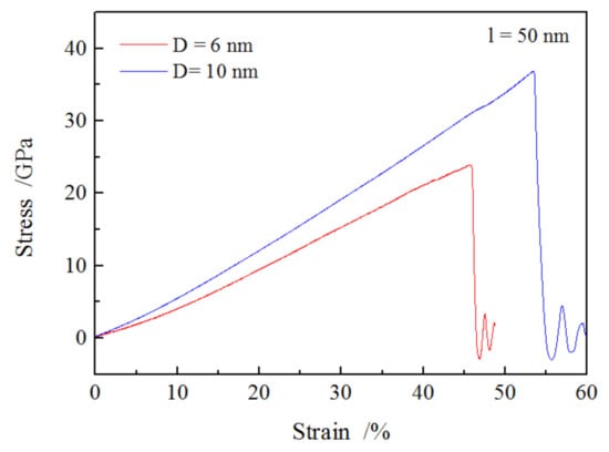 To more deeply investigate the effect of nanowire size on the tension properties and plastic deformation, an additional tension test for SiO2 nanowire with a diameter of 10 nm and a length of 50 nm was performed. The relationship between stress and strain is illustrated in Figure 6; the stress–strain curve of SiO2 nanowire with 6 nm-diameter is included for comparison. It showed that the applied stress for the SiO2 nanowire with a diameter of 10 nm was significantly higher than that of 6 nm at the same strain, as well as the fracture stress and the corresponding strain. The determined modulus for 10 nm-long nanowires was 44.7 GPa, which was 46% higher than that of 6 nm (30.6 GPa). This was consistent with the modulus obtained by experiments [11,36] and molecular dynamics simulation [19]. Although the surface effect could influence the elastic property due to the high ratio of specific surface area to volume in small nanowires, which could enhance the stiffness of nanowires [20], the much more dangling bonds and coordination defects (Si and O atoms with less coordination number) in surface area of the small nanowire, coupled with fewer internal atoms in small nanowires reduce the Young’s modulus [37].