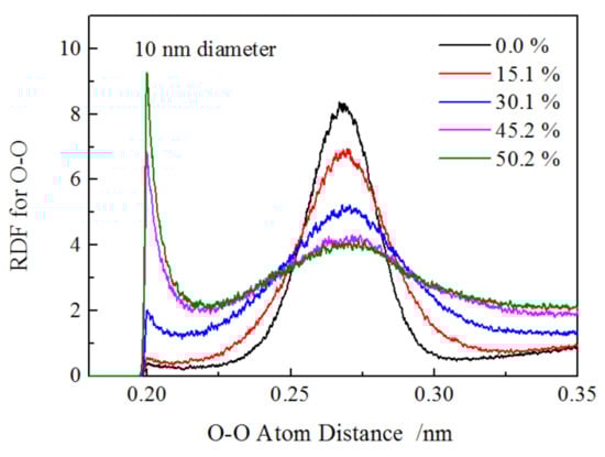 The O–O RDF for larger nanowire (10 nm-diameter) was investigated as well and is illustrated in Figure 7; it was found that the variation trend of the main peak and extra peak resembled that of the small nanowire. The main difference was that the height of extra peak for the larger nanowire was 0.4, and the ratio of extra peak height to main peak height was 0.048, which was much lower that of 6 nm-diameter nanowires (2 for extra peak height, 0.303 for the ratio) at the strain of 0.0%. From these results, we could conclude that the shorter and smaller nanowire exhibited a stronger size effect, causing the severe atomic arrangement occurring in the small nanowire due to its higher surface stress.