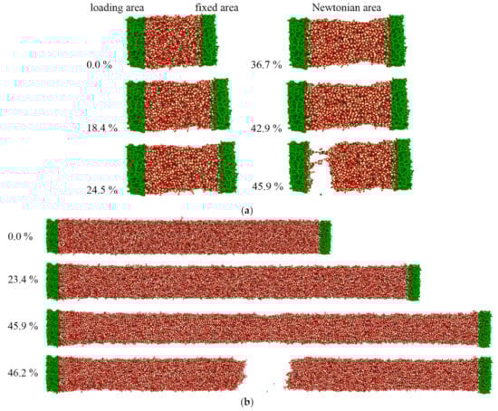 Atomic configuration of SiO2 nanowires during tension as a function of strain. (a) SiO2 nanowire with radius 6 nm and length of 10 nm and (b) SiO2 nanowire with radius 10 nm and length of 50 nm.