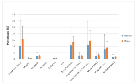 Efficiency of Mycobacterium avium subsp. paratuberculosis (MAP) DNA isolation in milk using selected isolation kits: DNeasy® Blood and Tissue kit (QIAGEN, Hilden, Germany), MagVet Mycobacterium paratuberculosis Isolation Kit (LSI, Lissieu, France), MagMAX™ Total Nucleic Acid Isolation Kit (Applied Biosystems by Thermo Fisher Scientific, Vilnius, Lithuania), Nuclisens Magnetic Extraction Reagents (Biomérieux, Marcy-l’Étoile, France), BioSprint 96 One-For-All-Vet (QIAGEN, Hilden, Germany), EZ1 DNA Tissue Kit (QIAGEN, Hilden, Germany), ZR Quick-DNA Fecal Soil Microbe Microprep Kit (Zymo Research, Tustin, CA, USA), ID Gene™ Mag Universal Extraction Kit (ID vet Genetics, Grabels, France), and ID Gene™ Mag Fast Extraction Kit (ID vet Genetics, Grabels, France). aut.—automatically processed. Error bars represent the 90th percentile and standard deviation for median and mean, respectively.