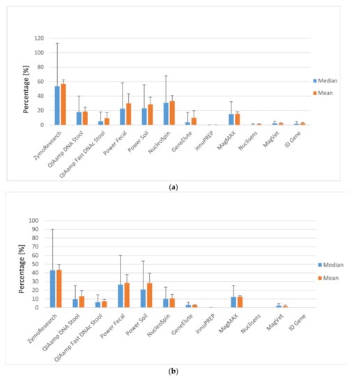 (a) Efficiency of MAP DNA isolation in faecal pellets using selected isolation kits: ZR Quick-DNA Fecal Soil Microbe Microprep Kit (Zymo Research, Tustin, CA, USA), QIAamp DNA Stool Mini Kit (QIAGEN, Hilden, Germany), QIAamp Fast DNA Stool Mini Kit (QIAGEN, Hilden, Germany), Power Fecal DNA Kit (QIAGEN, Hilden, Germany), DNeasy Power Soil Kit (QIAGEN, Hilden, Germany), NucleoSpin DNA Stool (Macherey-Nagel, Düren, Germany), Gen Elute Stool DNA Isolation Kit (Sigma-Aldrich, St. Louis, MO, USA), Innu PREP Stool DNA kit (Analytik Jena, Berlin, Germany), MagMAX™ Total Nucleic Acid Isolation Kit (Applied Biosystems by Thermo Fisher Scientific, Vilnius, Lithuania), Nuclisens Magnetic Extraction Reagents (Biomérieux, Marcy-l’Étoile, France), MagVet Mycobacterium paratuberculosis Isolation Kit (LSI, Lissieu, France), and ID Gene Mag Paratuberculosis Extraction Kit (ID vet Genetics, Grabels, France). Error bars represent the 90th percentile and standard deviation for median and mean, respectively. (b) Efficiency of MAP DNA isolation in faecal samples using selected isolation kits; for detailed isolation kit information, see (a). Error bars represent the 90th percentile and standard deviation for median and mean, respectively.