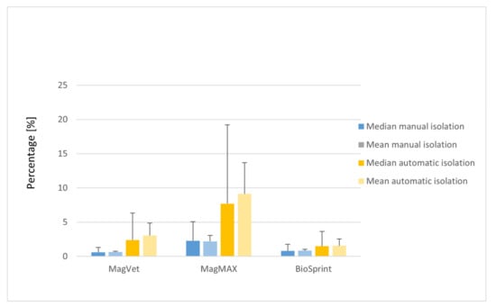 Comparison of MAP DNA isolation efficiency of manual and automatic magnetic separation in milk using selected isolation kits; for detailed isolation kit information, see Figure 1. Error bars represent the 90th percentile and standard deviation for median and mean, respectively.