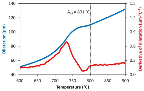 The first step was to determine the transformation temperature Ac3 (i.e., the temperature at which the ferrite is completely transformed into austenite by the heating process). The sample was heated with a rate of 5 °C·s−1 to a temperature of 500 °C; then, the heating rate was slowed down to 0.167 °C·s−1 to reach the maximum temperature of 1000 °C. Evaluation of the measured data was carried out using the semi-automatic CCT software (Dynamic Systems Inc., Poestenkill, NY, USA), which applies the tangential method in combination with the derivative of the dilatation curve to determine the transformation temperatures. The result of this test is presented in Figure 1.