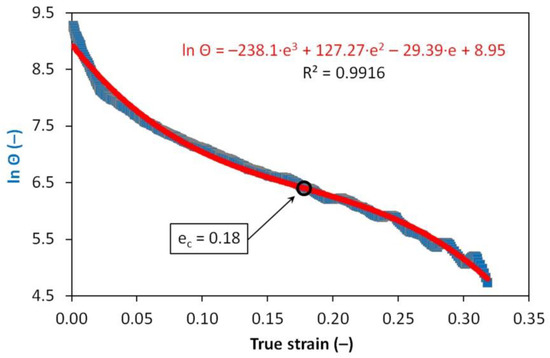 Stress–strain curves were experimentally determined for the strain rate of 1 s−1 and deformation temperatures of 880 °C and 830 °C. Uniaxial compression tests were performed on a Gleeble 3800 simulator. Cylindrical specimens with a diameter of 8 mm and a height of 12 mm were heated in the same mode as in the case of dilatometric tests. The critical strain values of ec required to initiate dynamic recrystallization were calculated from the obtained flow curves according to the procedure described and applied, e.g., in [53,54,55,56]. In the beginning, the first derivative of the stress- strain curve in its up-to-peak region with respect to the true strain has to be gained. Secondly, the obtained derivative (specifically the dependency of the logarithm of strain-hardening rate ln θ versus true strain e) is described by means of the third-degree polynomial. The inflection point, i.e., the result of the second derivative of this polynomial with respect to the true strain put into the equality with zero, then corresponds with the required value of strain ec—see Figure 3 for an example. The analysis of the flow curves was performed using data smoothing and numerical derivative in the OriginPro 9 software (OriginLab Corporation, Northampton, MA, USA).