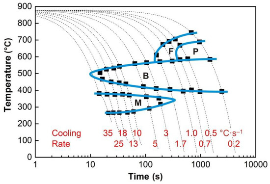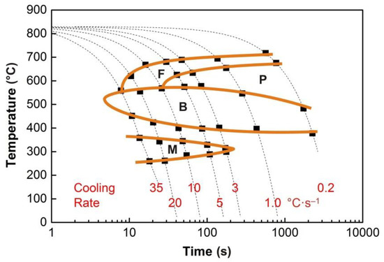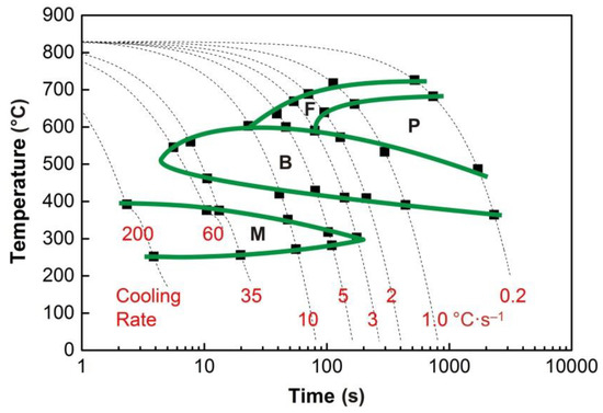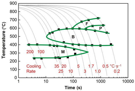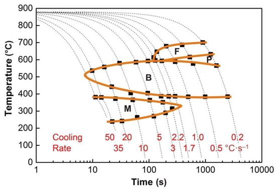 The individual phase transformations can be effectively controlled by the cooling rate of the rolled or forged steel products. This significantly contributes to achieving the desired combinations of mechanical properties of the material. The kinetics of austenite decomposition is not only fundamentally influenced by the chemical composition of the steel but also by the parameters of the structure entering the given phase transformation. The prior microstructure depends on the austenitization conditions, the parameters of the pre-deformation, and the cooling time [1,2,3,4,5,6]. The continuous cooling transformation (CCT) diagrams show the temperatures of the phase transformations, and the individual decomposition products of austenite depend on the cooling at different rates. They are always constructed for the specific austenitization parameters and initial microstructure. The deformation continuous cooling transformation (DCCT) diagrams include the effect of pre-deformation, characterized mainly by the strain value [7,8,9,10,11].