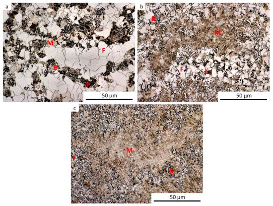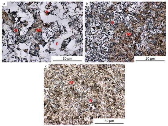 Microstructure of the samples after dilatometry—austenitization at 830 °C, strain e = 1.0. (a) Cooling rate of 0.2 °C·s−1; (b) cooling rate of 3 °C·s−1; (c) cooling rate of 35 °C·s−1.