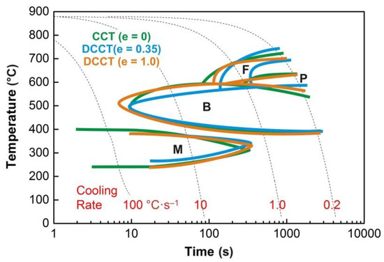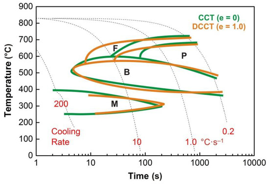The influence of the strain value on the kinetics of phase transformations is ambiguous. Varying the strain value from 5 to 25% had no influence on the phase transformations in manganese–nickel and manganese low-alloy steels but modified the microstructure after cooling due to the formation of coarser austenite grains under deformation of the “critical” strain value [52]. It depends considerably on the deformation temperature and thus on whether the already recrystallized austenitic or deformed grains enter the phase transformation. This is evidenced by the comparison of the CCT and DCCT diagrams constructed for the 34CrMo4, 42CrMo4, 52CrMo4, 51CrV4, and 34NiMo6 steels at a strain value of 0, 30, and 60% [22]. Due to the high temperature of plastic deformation (i.e., 1200 °C), the individual phase transformations were not affected directly by the deformation strengthening but only indirectly by the size of the recrystallized austenitic grain. Therefore, due to the pre-deformation, only slight changes in the curves corresponding to the start and finish of the phase transformations were observed.