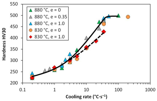 The graph in Figure 17 also corresponds well to the comparative Figure 15 and Figure 16. Considering the common scatter of the measured values, it can be stated that after high-temperature austenitization, the hardness is not affected by the previous strain value—see the trend indicated by the solid curve. In the medium cooling rate range, the hardness of the samples austenitized at 830 °C is relatively lower. This is particularly evident in the case of the pre-deformation e = 1, primarily due to the increased content of soft ferrite (see the dashed line).