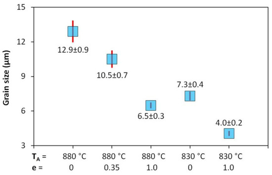 The prior austenitic grain data for samples cooled at a rate 10 °C·s−1 are compared in Figure 19. Confidence intervals (see the red vertical line segments) were estimated for the significance level α = 0.05.