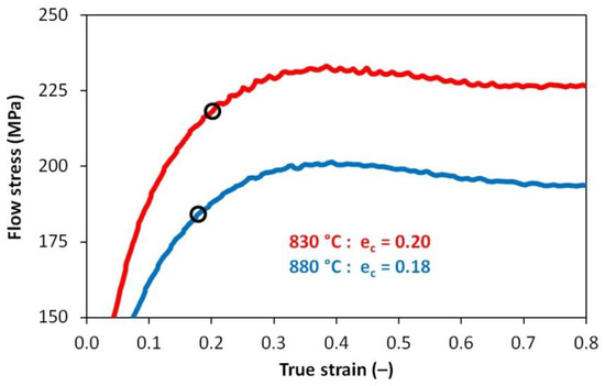 Experimentally determined stress–strain curves and strain ec values necessary to initiate dynamic recrystallization—detail of the peak stress area.