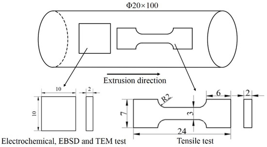 The samples were subjected to potentiodynamic polarization and electrochemical impedance spectroscopy (EIS, CHI660E, CH Instruments, Austin, TX, USA) with a size of 10 mm × 10 mm × 2 mm. The electrochemical performance of the samples was tested with a CHI660E electrochemical workstation (CHI660E, CH Instruments, Austin, TX, USA) in 3.5 wt.% NaCl solution (Shanghai Lingfeng Chemical Reagent CO., LTD, Shanghai, China). Before the test, the surface of each sample was ground with silicon carbide sandpaper and mechanically polished, then ultrasonically cleaned with alcohol. The nickel wire was connected to the electrochemical samples using an electric welder (PM103-3, Zhenjiang, China). Finally, the samples were encapsulated with epoxy resin. Three-electrode systems were used in these electrochemical measurements, i.e., the working electrode (the hot-rolled and ECAPed samples), the reference electrode (saturated Ag/AgCl) and the counter electrode (a piece of platinum). At first, a stable open circuit potential (OCP) for 10 min was been measured and analyzed. Then, EIS was performed at a frequency from 105 Hz to10−2 Hz using an AC voltage amplitude of ±10 mV. Finally, potentiodynamic polarization studies were performed using a voltage from −650 mV to 800 mV with a scanning frequency of 2 mV/s.
