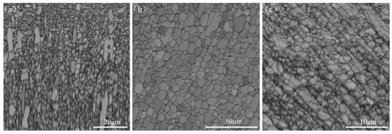 Microstructure of (a) hot-rolled, (b) annealed and (c) equal channel angular pressing (ECAP)ed Ti-2Fe-0.1B alloy as a result of electron backscatter diffraction (EBSD) (note the change of the scale bars).