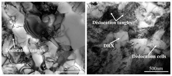 To pursue more detailed information of the microstructure, TEM micrographs of hot-rolled and ECAPed Ti-2Fe-0.1B alloy are presented in Figure 3. The microstructure of the hot-rolled sample mainly consists of nearly equiaxed grains with fewer dislocations and sharp boundaries, although few dislocation pile-ups also can be observed, as shown in Figure 3a. This might be attributed to high initial temperature and heat generation during the high-speed hot-rolling process, which leads to the occurrence of recovery/recrystallization during cooling in air. However, as a result of ECAP, a large volume of dislocations was formed and appeared in not only the grain boundaries but also in the grain interior. The dislocation tangle zones (DTZ) and dislocation cells (DC) can be clearly seen (Figure 3b). However, several dislocation-free grains were also founded in the microstructure, which indicated that continuous dynamic recrystallization started to happen during ECAP with four passes.