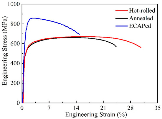 The engineering stress–strain curves of hot-rolled, annealed and ECAPed Ti-2Fe-0.1B alloy are displayed in Figure 4. The yield stress (σ0.2) and tensile stress (σs) of hot-rolled sample reach around 457 MPa and 663 MPa, respectively. Furthermore, the elongation to failure of hot-rolled sample can reach around 30%, which indicated a good combination of strength and ductility. On the other hand, after annealing at 780 °C/1 h, the strength of the sample changed slightly, but the ductility decreased to around 24%. The yield stress and tensile stress of the sample increased to around 637 MPa and 854 MPa respectively after the subsequent ECAP process, furthermore, 15% elongation to fracture left.