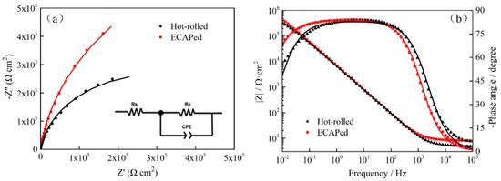 The EIS results of hot-rolled and ECAPed Ti-2Fe-0.1B alloy by the method of Nyquist plots and Bode plots in 3.5 wt.% NaCl solution are shown in Figure 6. The points in the figure represent experimental data, and the solid lines represent electrical equivalent circuit (EEC) fitting data. It can be seen that Nyquist plots are composed of semi-circular arcs for both of the two state samples (Figure 6a). The arc radius of the hot-rolled sample is much smaller than the ECAPed state, which implies that the ECAPed sample has a stronger inhibitory effect on electron transfer and also has a better capacitance characteristic [26,27]. The EEC model used in the present work is inserted into Figure 6a, where the Rs is solution resistance, Rp is polarization resistance and CPE is a constant phase element. The CPE reflects the capacitance of the passivation film, which can be calculated using Equation (2).