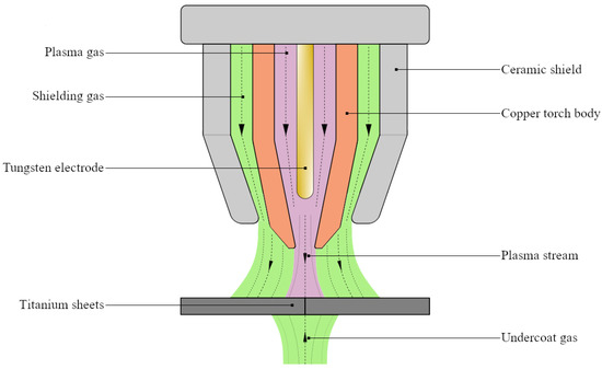 In order to obtain dimensional consistency between the samples and test results, titanium specimens were manufactured following a set of procedures. First, cutting off the initial shapes of the elements were carried out using the laser plotter from the rolled titanium sheets with their longitudinal axis coinciding with the rolling direction. Next, the sample elements were secured in position in the welding machine before they were joined by welding of their edges using microplasma arc welding under protective gas (helium) without the use of filler material. The welding machine used in the process was automated with a set welding speed. Figure 2 presents a simplified schematic of microplasma arc welding process. Cut plates were aligned on the welding device and fixed in position during welding with the use of bolts and a support device. Alongside the automated welding process, this prevented potential misalignments that might occur during welding. The welding parameters used for joining sample elements are listed in Table 2.