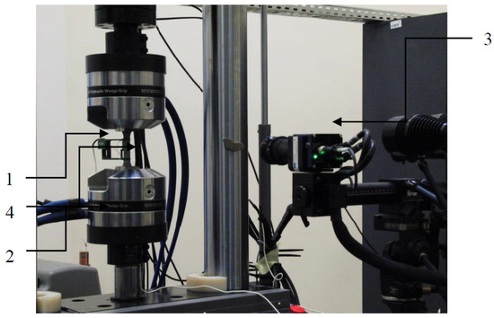 Monotonic tests were carried out according to the standard of PN-EN ISO 6892-1:2016-09 [27] and with a constant speed of mm/s and. The tests were controlled by using an Epsilon 50 linear extensometer with a 50 mm base (1) and monotonic loading was applied with a servo-hydraulic strength machine MTS 809 A/T (Eden Prairie, MN, USA) (2). In addition to the extensometer, sample deformation was measured with the ARAMIS 4M vision system (3). Experimental setup, along with the test sample (4) is shown in Figure 4. Throughout the test, the mechanical properties of the samples were monitored and recorded. Furthermore, GOM ARAMIS 4M vision system (Braunschweig, Germany) was used to observe sample deformation via the digital image correlation (DIC) method. Each sample type was tested three times and an arithmetic mean of 3 repeats was used to determine the monotonic properties of each, respectively.