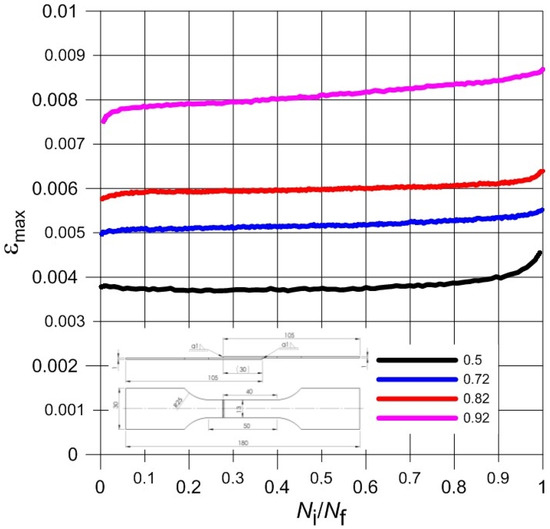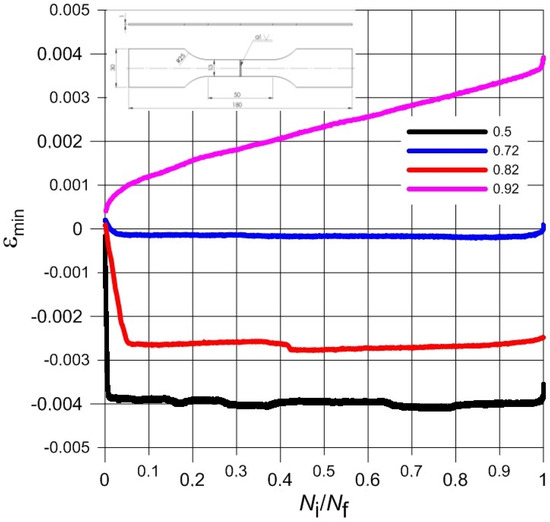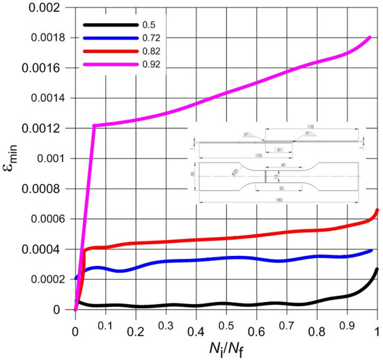 Normalized waveforms of minimum and maximum values of total strain recorded during cyclical loading of samples with respect to the number of cycles were presented in Figure 6, Figure 7, Figure 8 and Figure 9 for both weld types. Generally, the maximum and minimum strain of samples follows a similar course through the testing. However, for type 3 samples, there is an exponential increase in minimum strain in comparison to the maximum strain, which almost remains linear during samples’ fatigue life, especially at higher load levels. In addition, the negative strain values in the unloading cycles can be seen in Table 5. Since the loading was unidirectional and samples were never compressed, this was considered a minor measuring error due to the extensometer. It should be noted that the negative strain values are negligibly small.