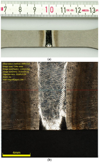 Macroscopic images of Type 2 specimen (a) and detailed image of its weld bead; (b) before fatigue cracks.